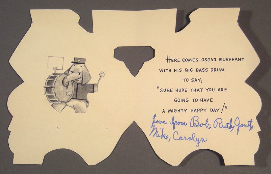 ゾウが太鼓でお祝いしてくれているヴィンテージのバースディカードです。