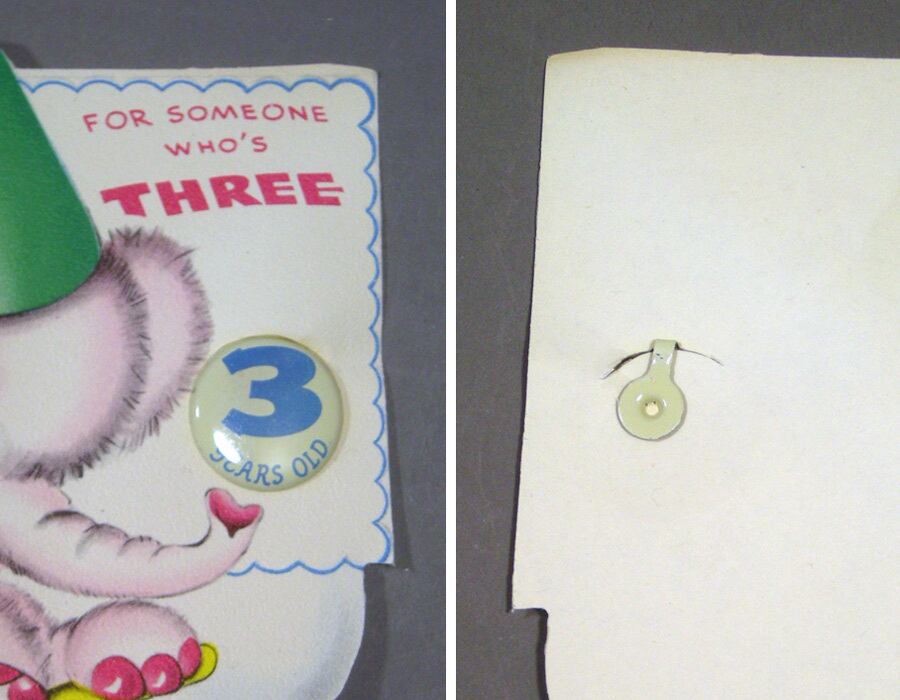 『3 YEARS OLD』と書かれたバッジのような金属製のクリップが付いています。
