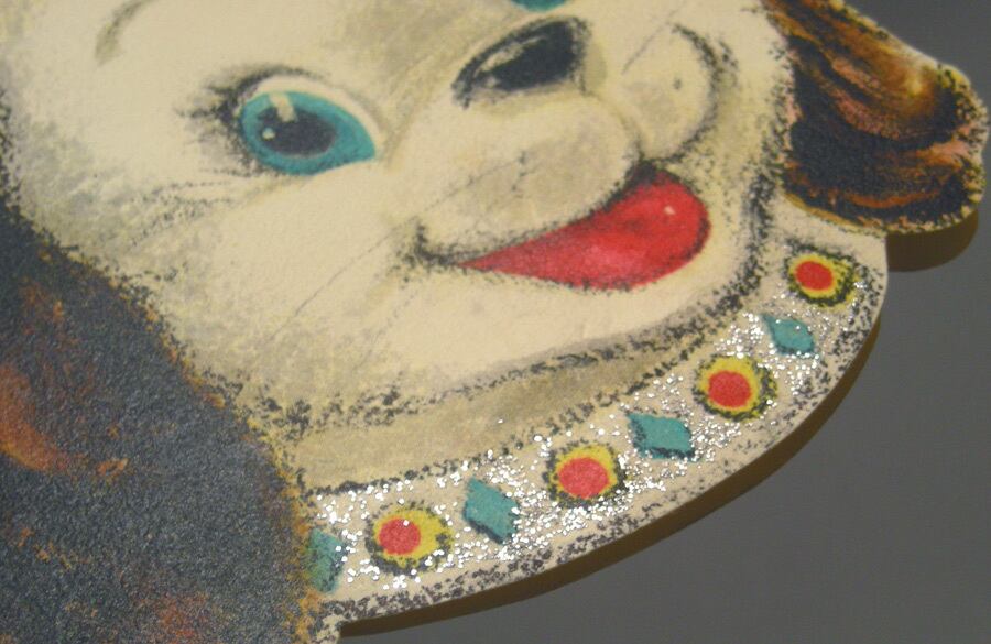表絵、首輪に光の角度でキラキラするグリッター加工が施されています。