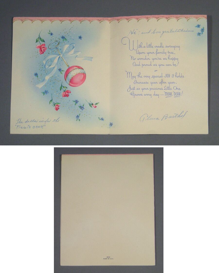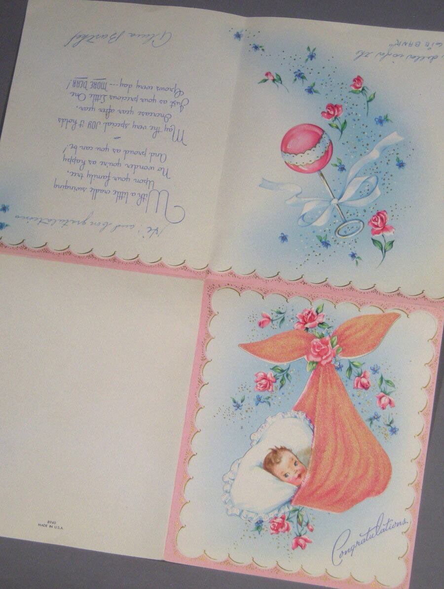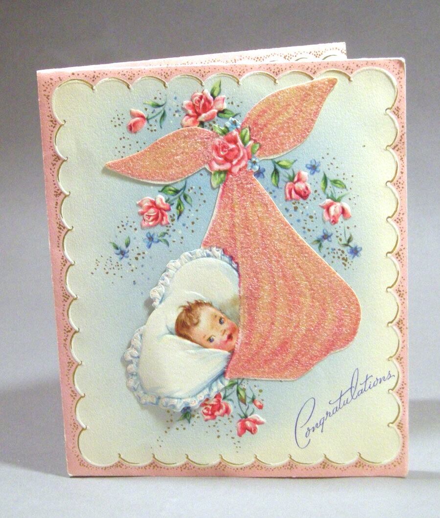 赤ちゃんが包まれてるイラストの部分だけ、別の紙で貼付けられている凝ったつくりのヴィンテージカードです。