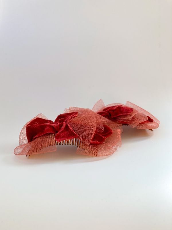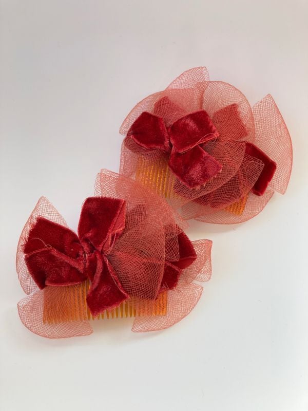 1950's -ヴィンテージ リボン&チュール ヘアアクセサリー- Vintage "VELVET RED BOW & TULLE" Head Piece Comb【バラ売り】