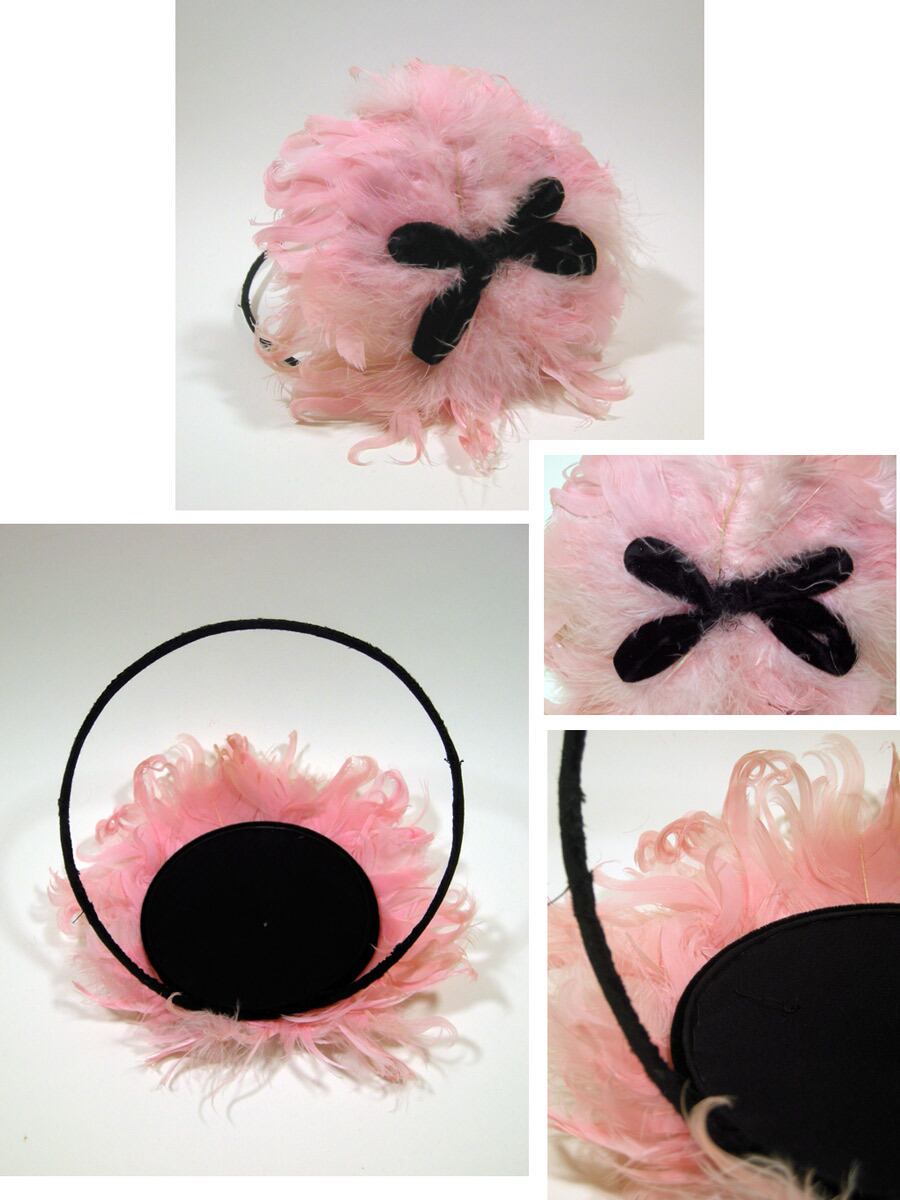 1940's -ヴィンテージフェザー&ブラックリボン ヘアアクセサリー -Vintage "BURLESQUE!" Pink Feather & Black Bow Hat